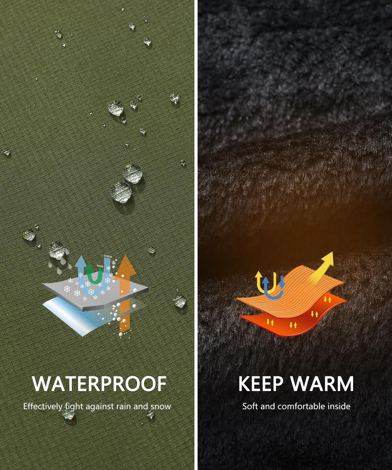 - The advanced waterproof fabric creates a reliable barrier against rain, snow, and harsh wind conditions, while the plush fleece lining delivers exceptional insulation without excess bulk.